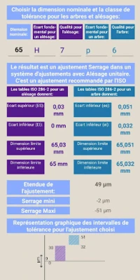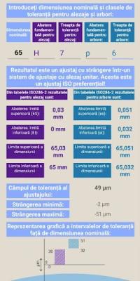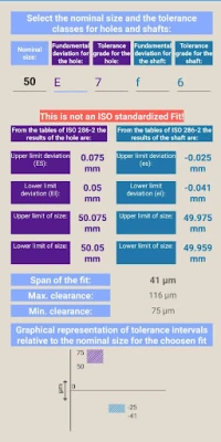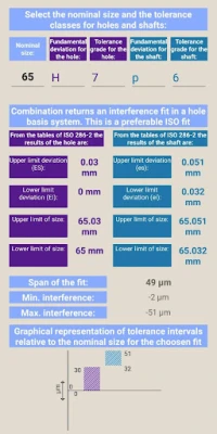 Upon entering the nominal dimension, the user selects the tolerance classes for holes and shafts, then the application provides, the complete information regarding the chosen fit, all relevant values including, type of fit, basis system, if it is a recommended or preferable fit and a graphical representation of the tolerance intervals.