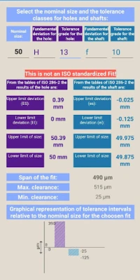If the user selects other tolerance grades that the ones recommended by ISO 286, the application will calculate the resulted fit, but it will also print a red highlighted message mentioning that the selected combination does not return an ISO standardized fit. The same message is generated if the user does not select a hole or a shaft basis system. When selecting other nominal dimensions that the ones listed in ISO 286-2, for each tolerance class, the application will generate a message indicating the interval for the selection of the nominal size.