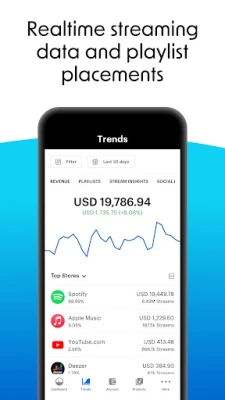 On the Cashboard, in addition to a summary of key trend data and information about your listeners, you'll also see the estimated amount of your next three payouts. Furthermore, our artificial intelligence "Muse" will give you a reliable forecast of your future streaming revenues for the next 6, 12 and even 24 months. Know today what you will earn tomorrow. Gain reliability for your financial planning and understand at what point you will get how much money.
