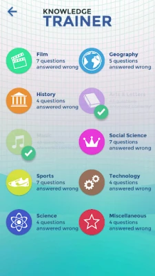 Improve your general knowledge with regular training. You can review category-specific statistics as you go to see how you have progressed after each quiz round.