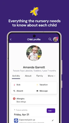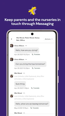 You’ll even receive photos and videos of your little one, so you can be sure they’re happy. The app also features two-way communication between you and your child’s nursery, enabling a variety of functions:· See your child’s daily activity and access learning journeys· Message the nursery, answer permissions or notify pick up changes.