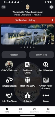 The Waynesville Police Department mobile application is an interactive app which will help improve our communication with the citizens of Waynesville, NC and surrounding area. The purpose of this app is to improve our ability to communicate with our citizens Information which will include, but not be limited to Submit a Tip, Sex Offenders, Agency Programs, Most Wanted and more. Citizens may submit a crime tip directly through the app, as well as see and share social media posts. By empowering people through technology, the Waynesville Police Department will be able to better protect our county.